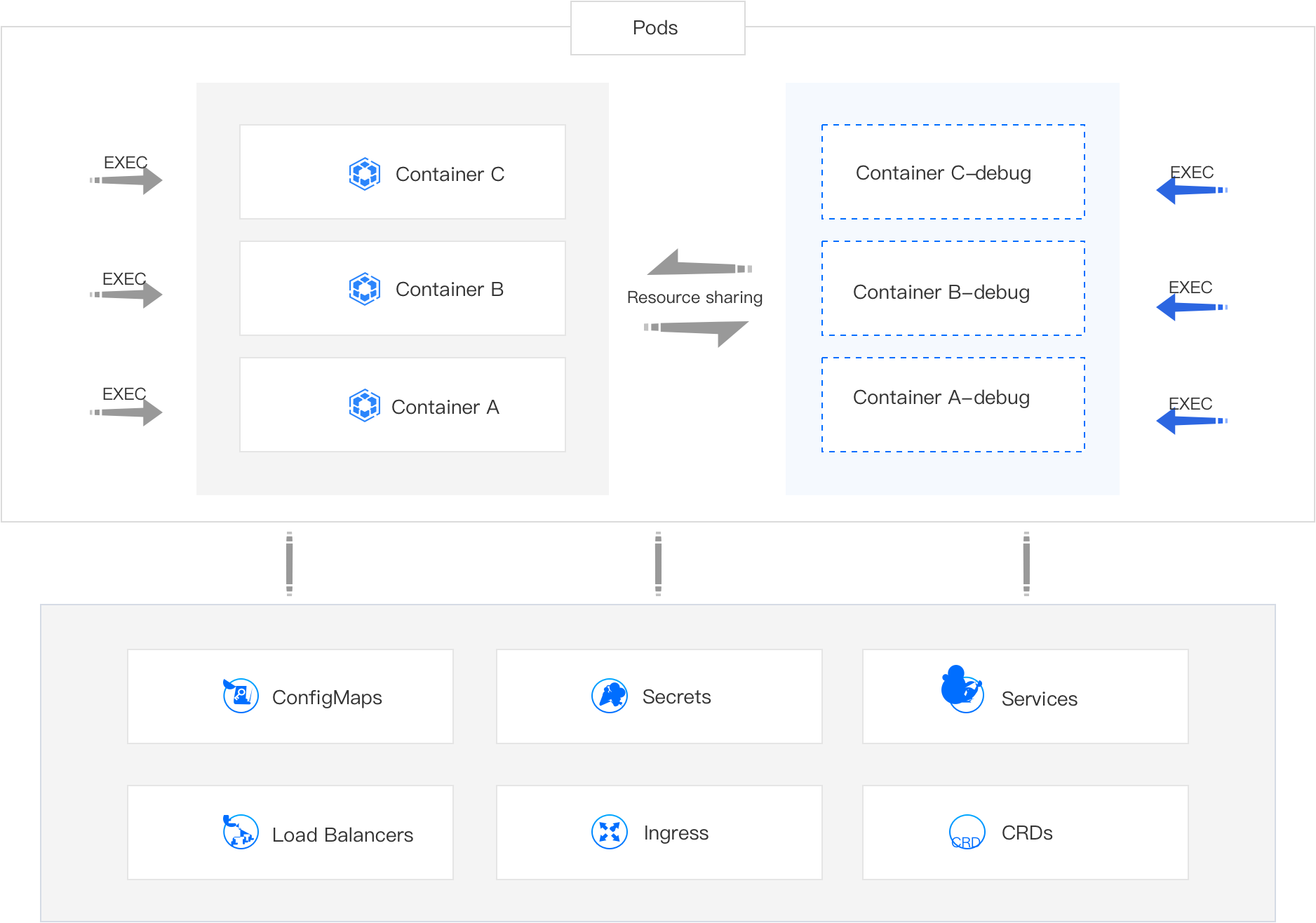 The Debug feature is implemented through Ephemeral Containers. An Ephemeral Container is a type of container that shares resources with business containers. You can add an Ephemeral Container (for example, Container A-debug) to a pod and use debugging tools within that container. The debugging results will be directly applied to the business container (such as Container A).